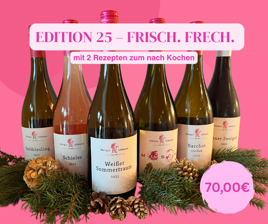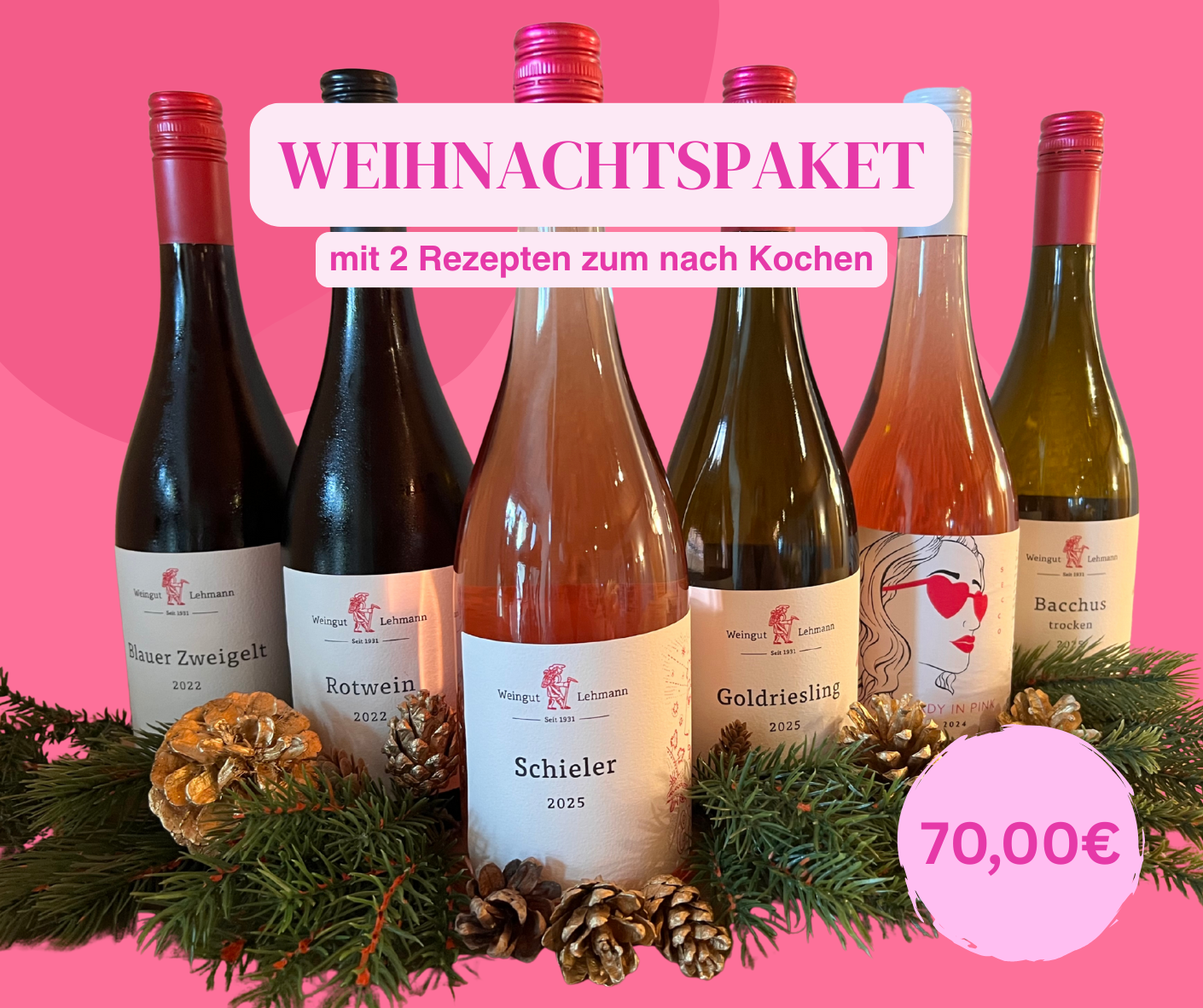Ein Fest für Genießer! Sechs erlesene Weine, die perfekt unter den Baum passen: 22er Blauer Zweigelt, 22er Rotwein, 25er Schieler, 25er Goldriesling trocken, Secco Pink und 25er Bacchus.