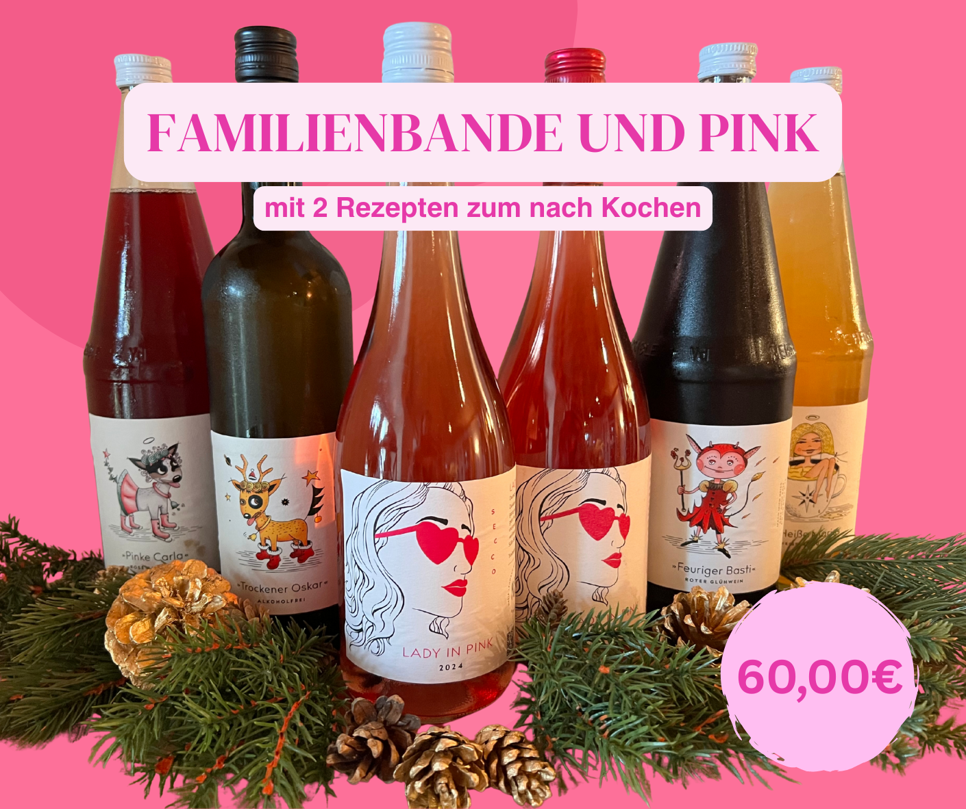Unsere vier Glühweine – benannt nach den Familienmitgliedern – vereint mit einer Flasche Lady in Pink Wein und Secco. Liebe, Wärme und ein Hauch von Glitzer in jeder Flasche.